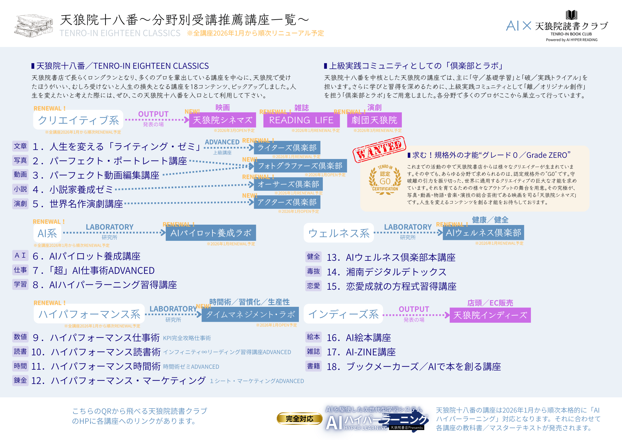 AIハイパーラーニングに対応した、天狼院の「18の得意分野」。
