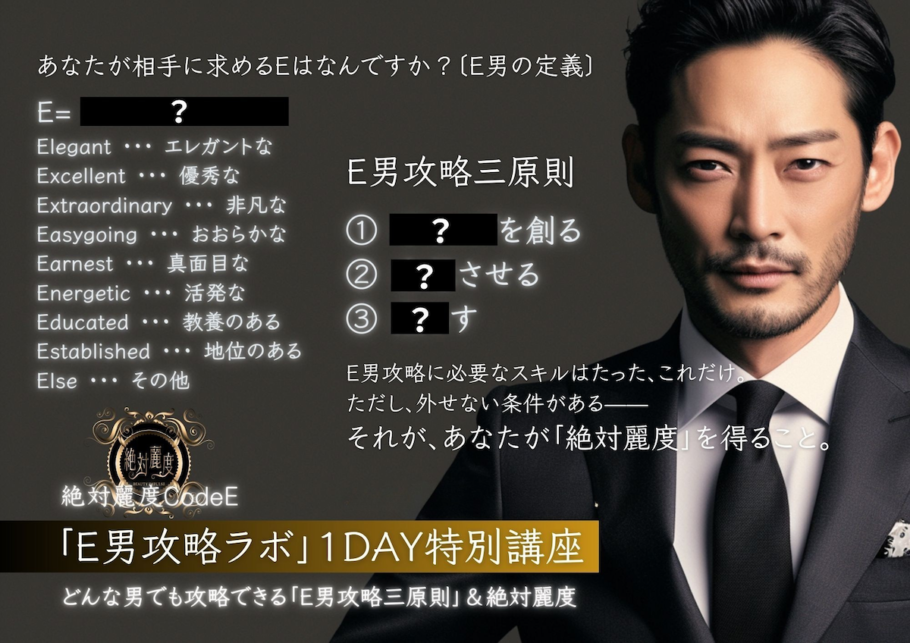 さらに、「E男攻略ラボ」1DAY特別講座の内容もバージョンアップしてお伝えいたします。