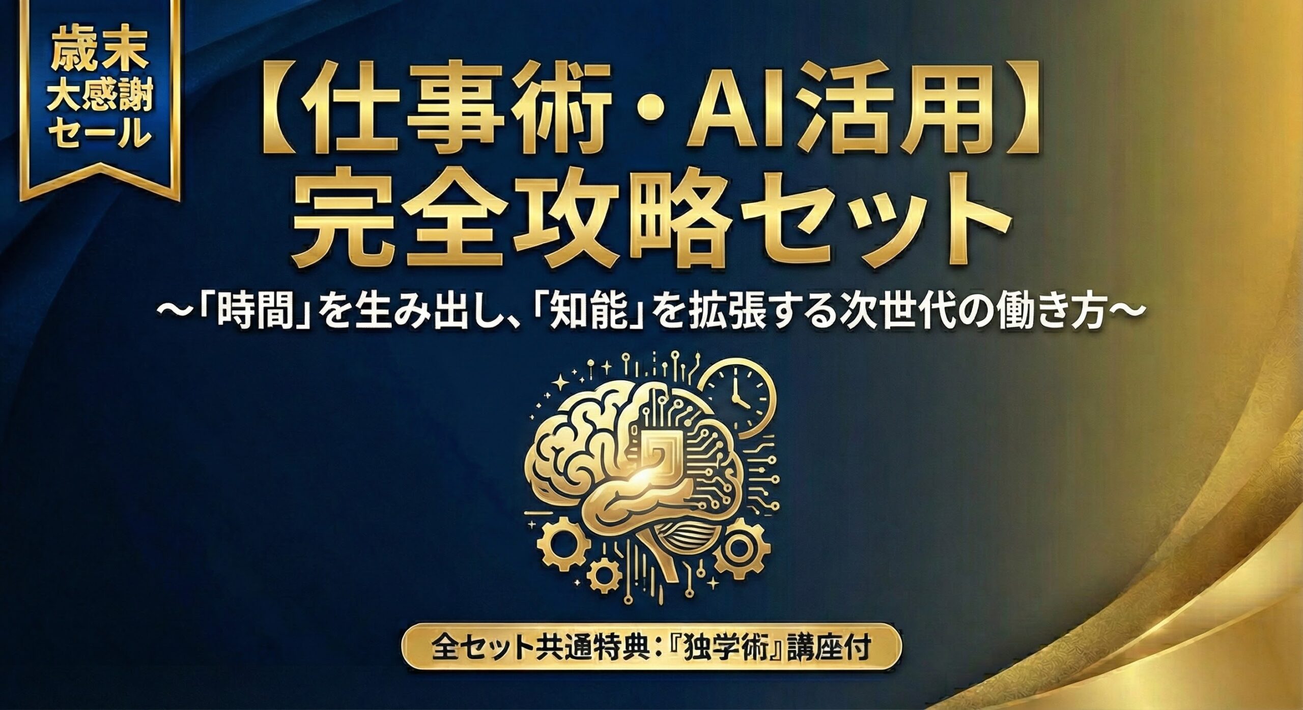 このセットは、あなたに「時間」をプレゼントします。「空間×仕事×思考の整理術」や「iPad仕事術」で脳内のメモリを解放し、クリエイティブな作業は「ChatGPT」「Midjourney」などの生成AIに任せる。