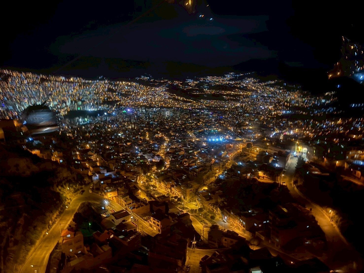 ゴンドラから見下ろすラパスの夜景。オレンジ色の明かりが多い、この美しい夜景は、街の発展とともに数年で白い光に変わり、やがて消えてしまうかもしれないという。