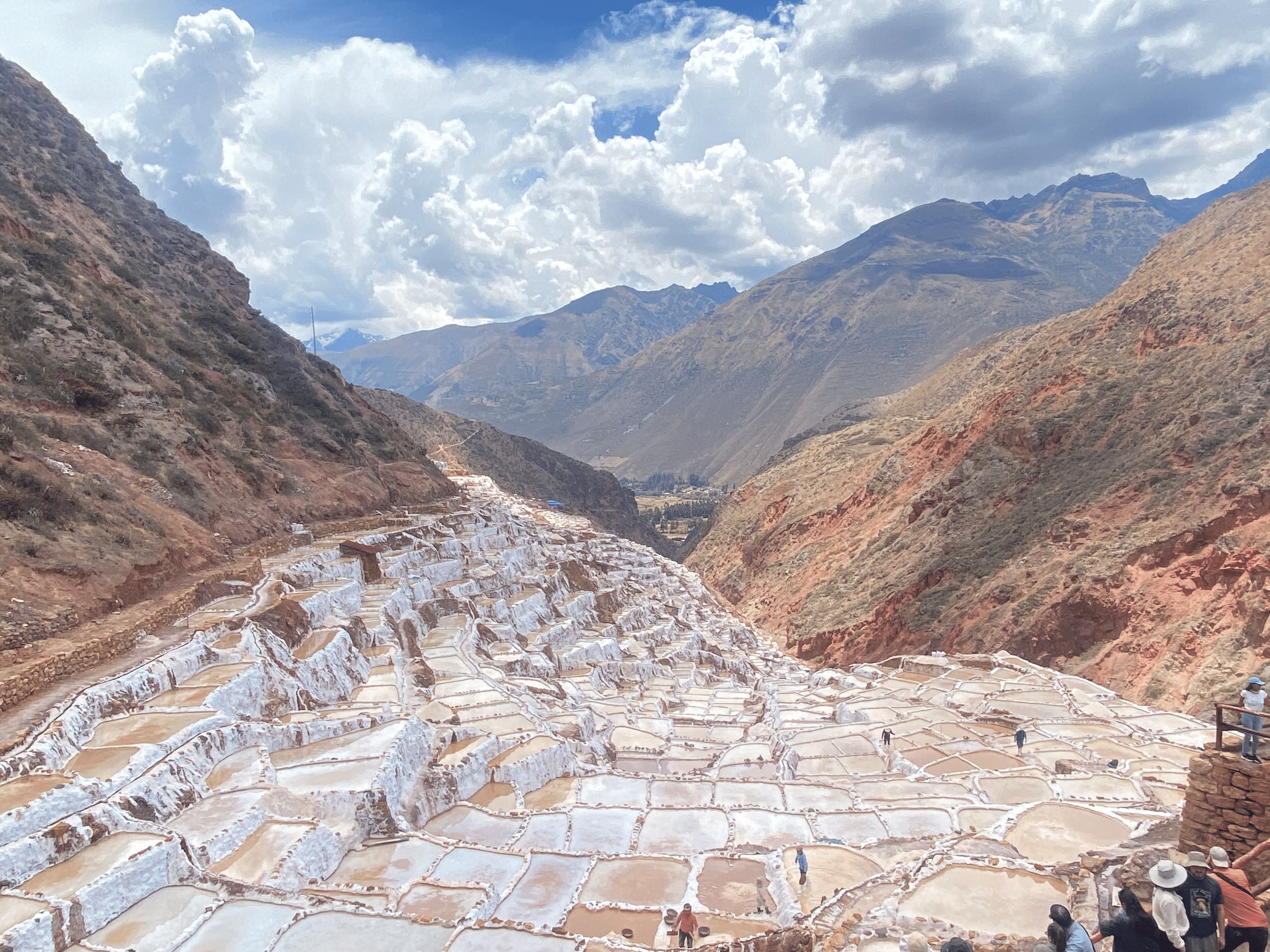 山肌を埋め尽くすマラス塩田。この「カマンベールチーズみたい!」という衝動的な言葉が通じて、ガイドが大笑いしてくれた瞬間。言葉の壁はノリで壊せる。