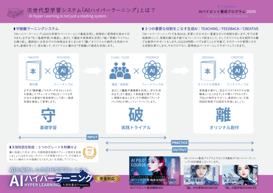 具体的には、グレード・スリーは1つの生成AIを使うことができるレベル、グレード・ツーは複数の生成AIを自在に使うことができるレベル、そしてグレード・ワンはあらゆる生成AIを自在に使うことができ、さらには複数の生成AIでオリジナルAIを自在に創ることができるレベルとなります。