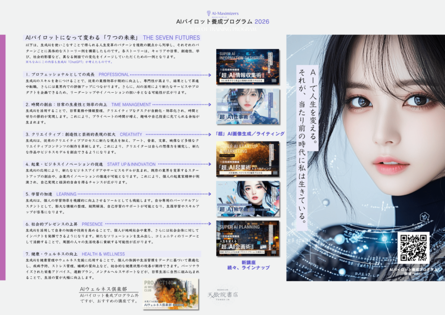 私は、このプログラムが、単なるスキル習得の場ではなく、新しい時代を切り拓く力を身につける場になると確信しています。なぜなら、AIパイロットになるということは、単にAIを操作できるようになるということではないからです。 それは、AIと共に新しい価値を創造する力を身につけるということです。