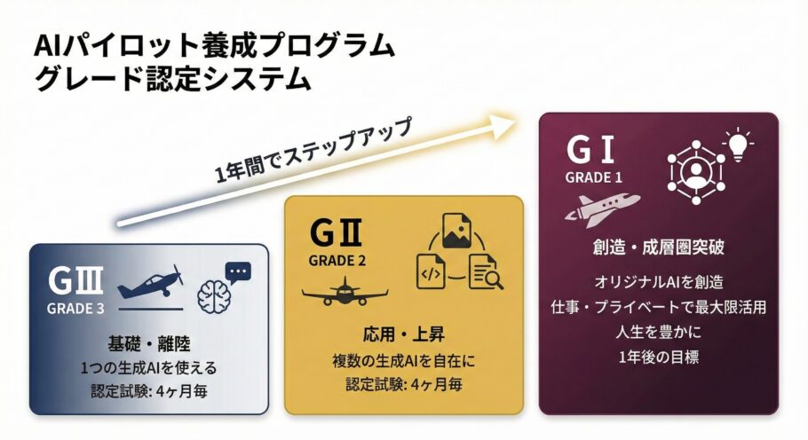 AIパイロット養成プログラムは、1年間で“グレード制度”を攻略して、AIパイロットになるためのプログラムです。