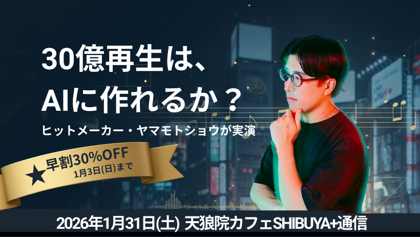 《早割1月3日まで》渋谷・通信【1/31(土)13:30〜】30億再生は、AIに作れるか? ── ヒットメーカー・ヤマモトショウが実演する《AI×音楽》創作の設計図